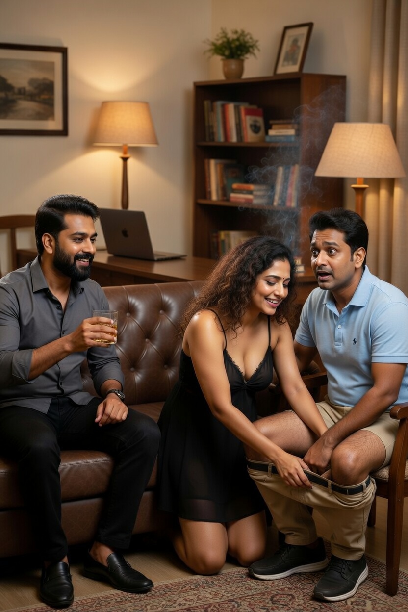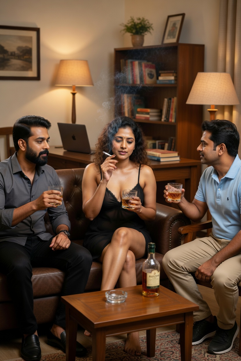 ശ്രീജിത്ത് ഒരു വലിയ പെഗ്ഗ് വിസ്കി ഒറ്റയടിക്ക് കുടിച്ചു തീർത്തു. ലഹരി അവന്റെ തലയ്ക്ക് പിടിച്ചിരുന്നു. ശ്രീജിത്ത്: "അഞ്ജലി... അവൾ പാവമാണ് രേവതി. പക്ഷെ ബെഡിൽ അവൾക്ക് ഒന്നും അറിയില്ല. എപ്പോഴും ആ കുർത്തി ഇട്ട് വരും, അല്ലെങ്കിൽ പഴയ സാരി. അവൾ ഇങ്ങനെ പതുങ്ങിയിരിക്കും. എനിക്കാണെങ്കിൽ അത് കാണുമ്പോൾ ഒരു മൂഡും വരുന്നില്ല. അവൾ വന്ന് കഷ്ടപ്പെട്ട് ഊമ്പി തരുമ്പോൾ എനിക്ക് അവളോട് സഹതാപമാണ് തോന്നുന്നത്. അല്ലാതെ പണ്ണാൻ ഒരു ആവേശം വരുന്നില്ല."